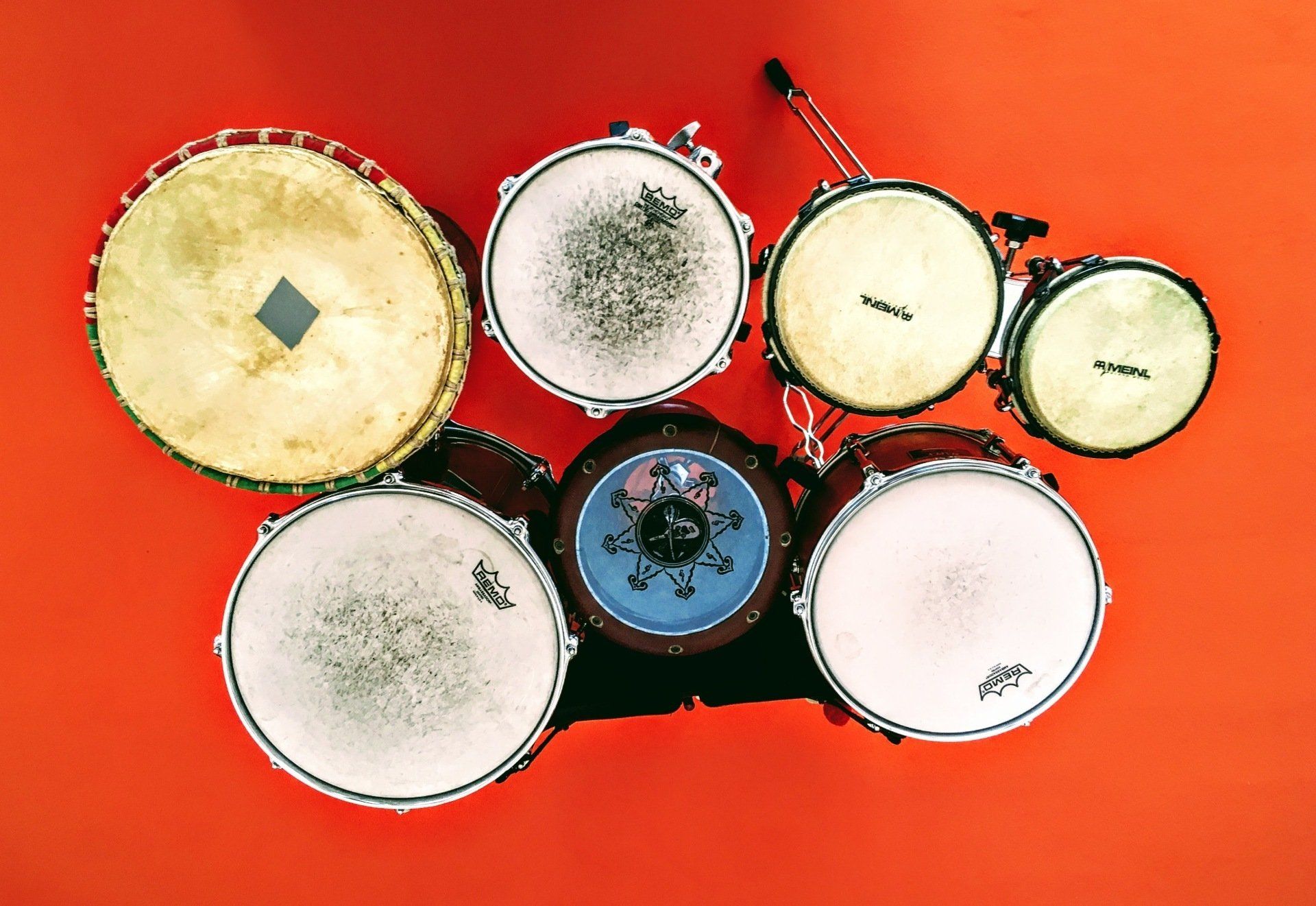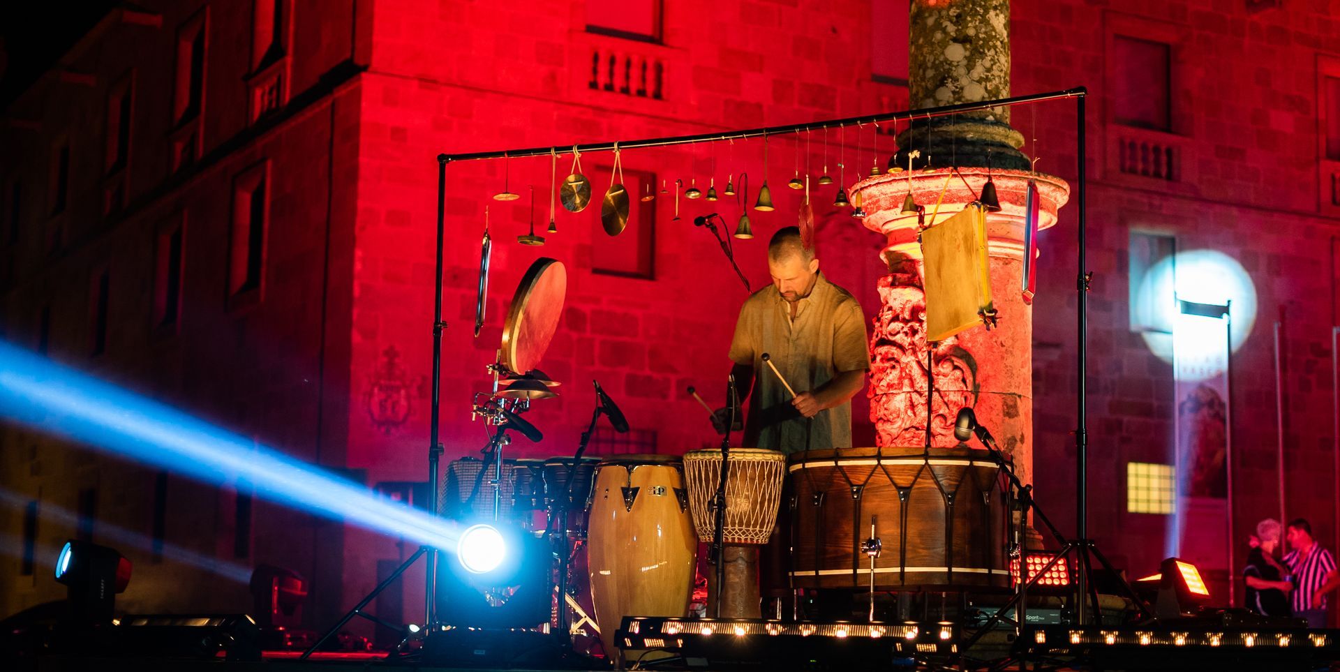 Nuno Morão: kit de percussão com membranofones, sinos e gongos.